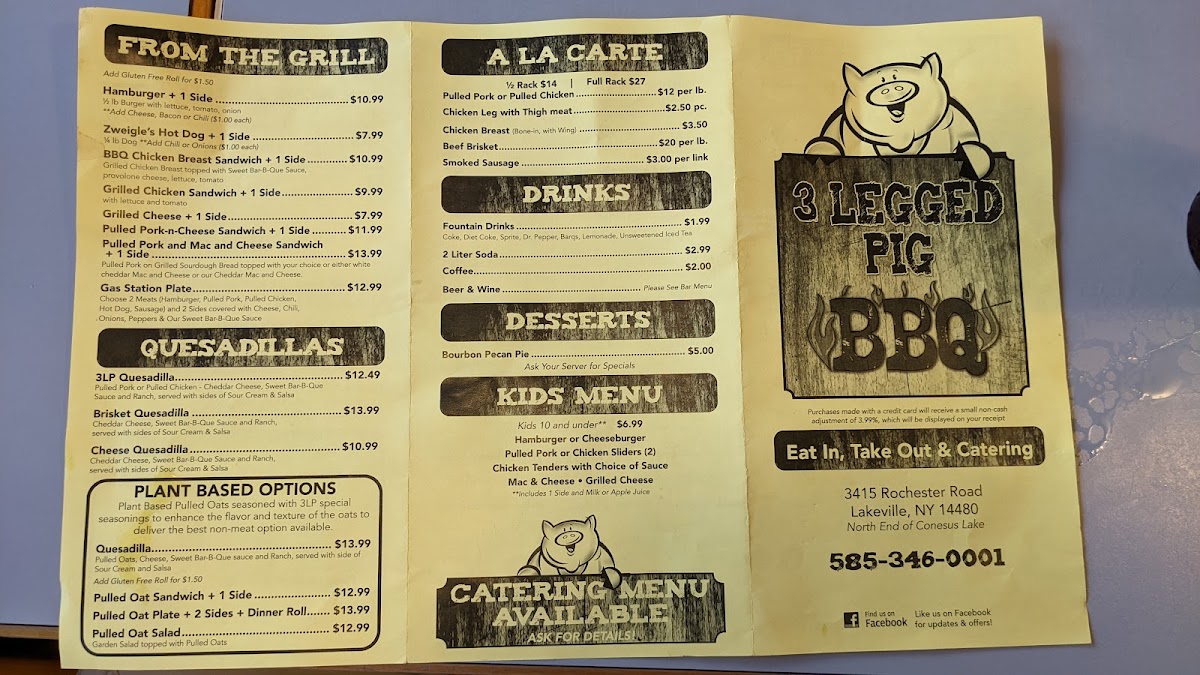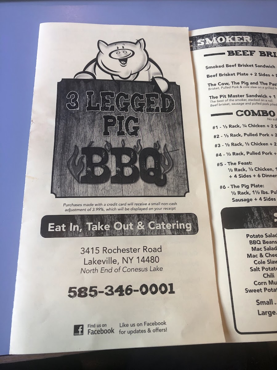 Welcome to 3 Legged Pig BBQ Real Pit BBQ, a hidden gem located at 3415 Rochester Rd in Lakeville, NY, where authentic barbecue reigns supreme. The menu proudly showcases its specialties, highlighting tender pulled pork and succulent beef brisket. Offering a delightful variety, you can savor a Pulled Pork Sandwich with sides or indulge in their signature Beef Brisket Plate, all served with fresh dinner rolls.